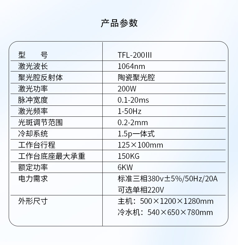 TFL-200Ⅲ型模具激光焊機(jī)是通發(fā)激光公司在TFL-180Ⅲ的基礎(chǔ)進(jìn)行了改良,采用通發(fā)自主研發(fā)的二代精密單燈電源為燈泵浦驅(qū)動電源,配置觸摸屏,操作更方便。主機(jī)具備激光頭手搖升降與工作臺按鈕電動升降實(shí)現(xiàn)焊接不同厚度模具的激光焊加工。本款機(jī)型更適用于各類高精密注塑模具激光補(bǔ)焊,精密塑膠模具零件激光修補(bǔ),塑膠模具鈹銅零件激光燒焊;可對模具使用過程中出現(xiàn)的磨損進(jìn)行激光修復(fù);對機(jī)械加工失誤、電火花加工失誤,模具減膠設(shè)計(jì)變更等需要對模具修改,起到關(guān)鍵的作用,可彌補(bǔ)因加工失誤造成的巨大損失。