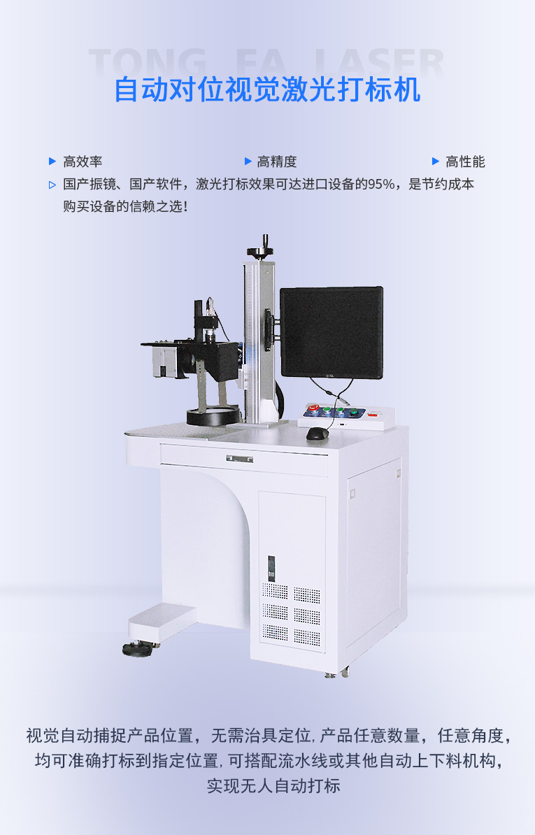 通發(fā)激光研發(fā)的自動(dòng)對(duì)位視覺(jué)激光打標(biāo)機(jī)TFL-F20CY-ZD,視覺(jué)自動(dòng)捕捉產(chǎn)品位置,無(wú)需治具定位,產(chǎn)品任意數(shù)量,任意角度,均可準(zhǔn)確打標(biāo)到指定位置,可搭配流水線或其他自動(dòng)上下料機(jī)構(gòu),節(jié)省人力,實(shí)現(xiàn)無(wú)人自動(dòng)打標(biāo),可搭配流水線或其他自動(dòng)上下料機(jī)構(gòu),節(jié)省人力,實(shí)現(xiàn)無(wú)人自動(dòng)打標(biāo),極高的重復(fù)頻率,打標(biāo)速度快;極高的光學(xué)質(zhì)量,實(shí)現(xiàn)精細(xì)打標(biāo),可與光纖、CO2、半導(dǎo)體等各種波長(zhǎng)的激光光路集成.